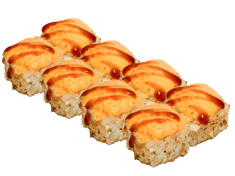угорь, имитация краба, сыр, соус для запекания, соус унаги, кунжу...